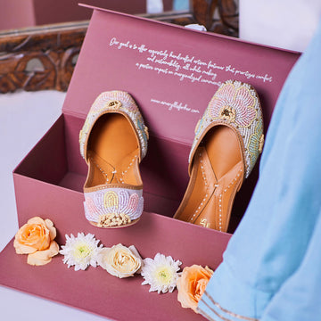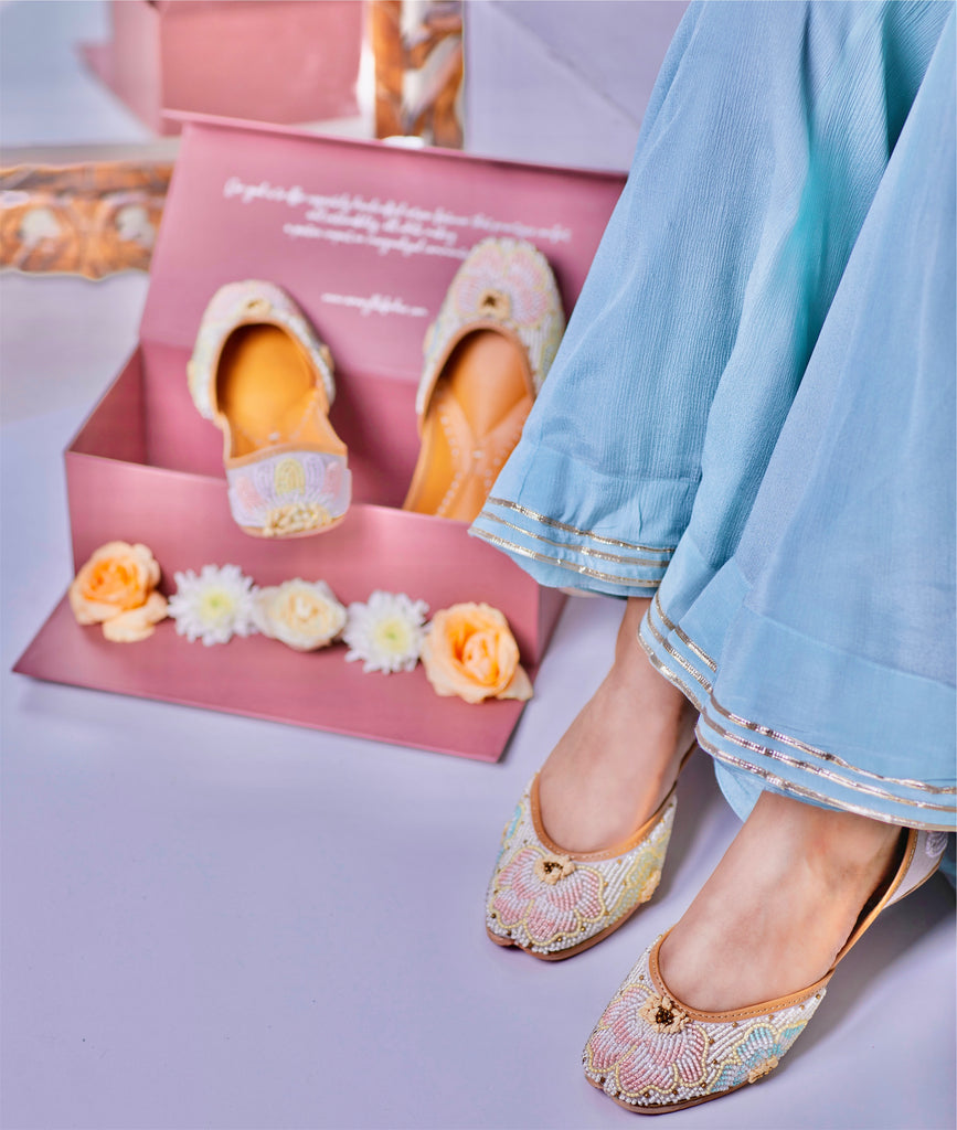 Sitara – our latest handcrafted jutti in ivory with delicate pastel hues and a touch of gold, featuring a beautiful floral bloom pattern. Perfect for elevating your everyday look, whether styled with jeans or just dress it with a cute pretty short or middy outfit. You can’t go wrong with styling this one!