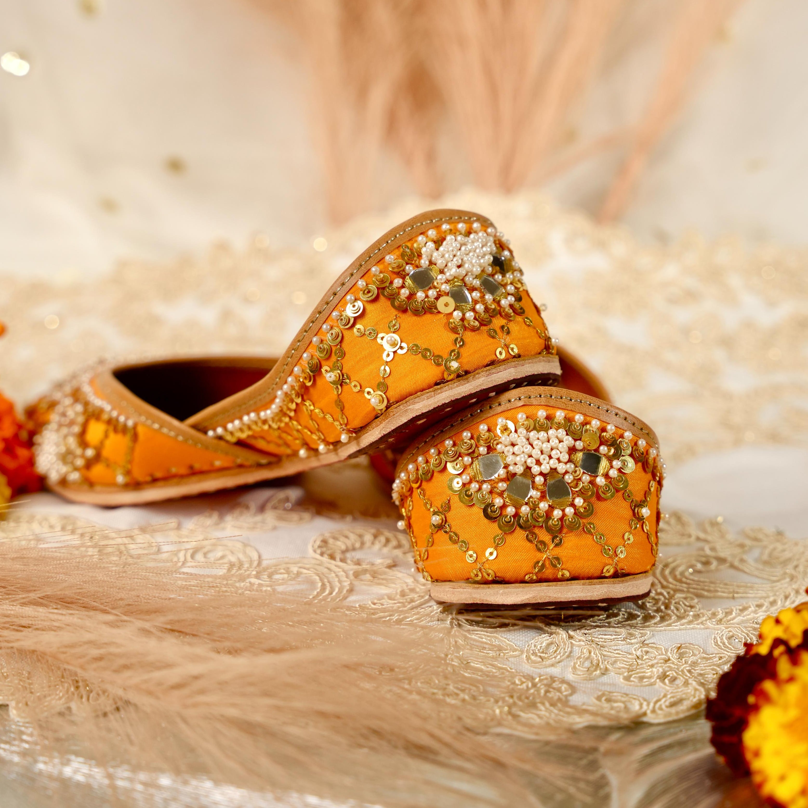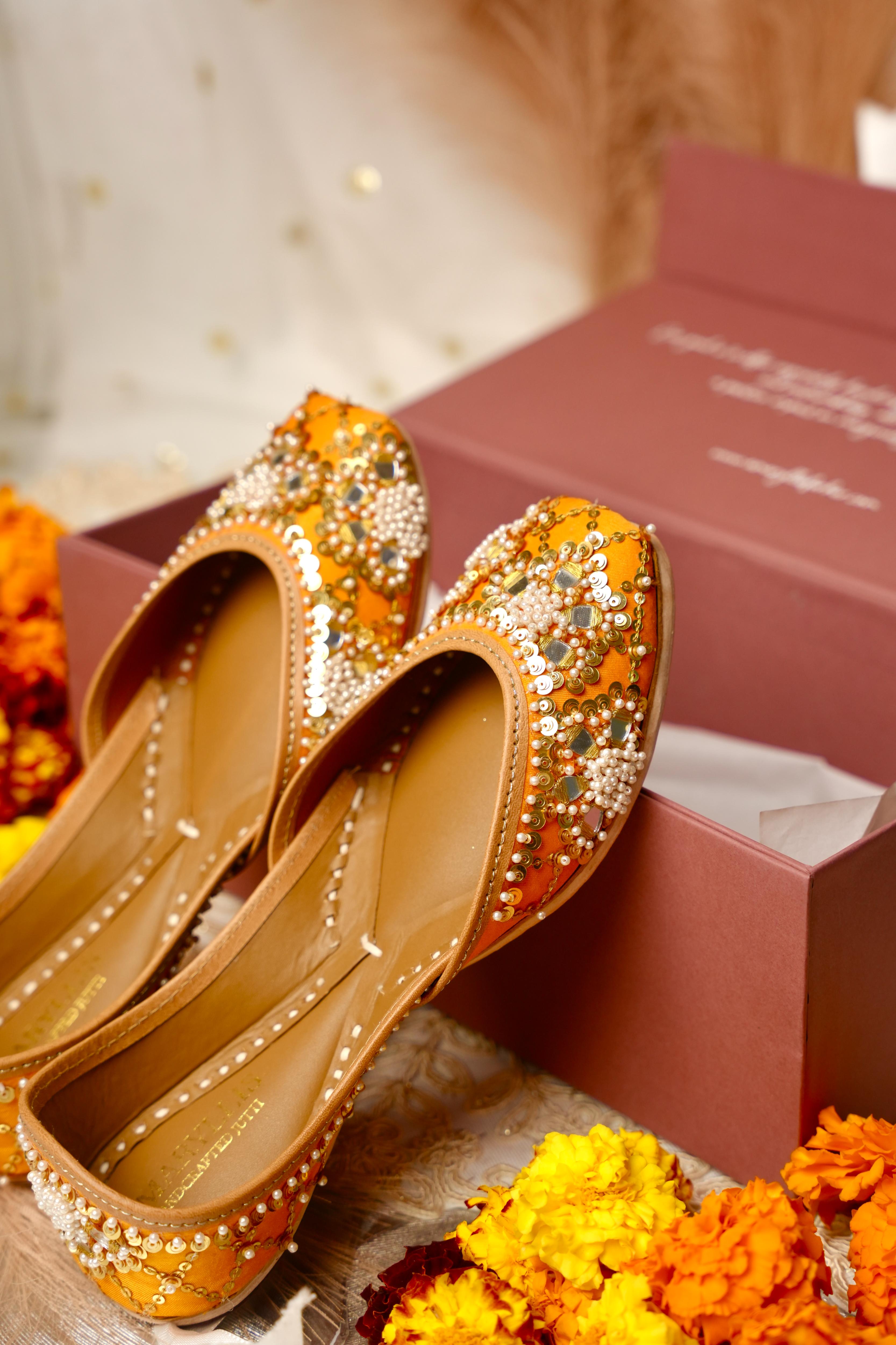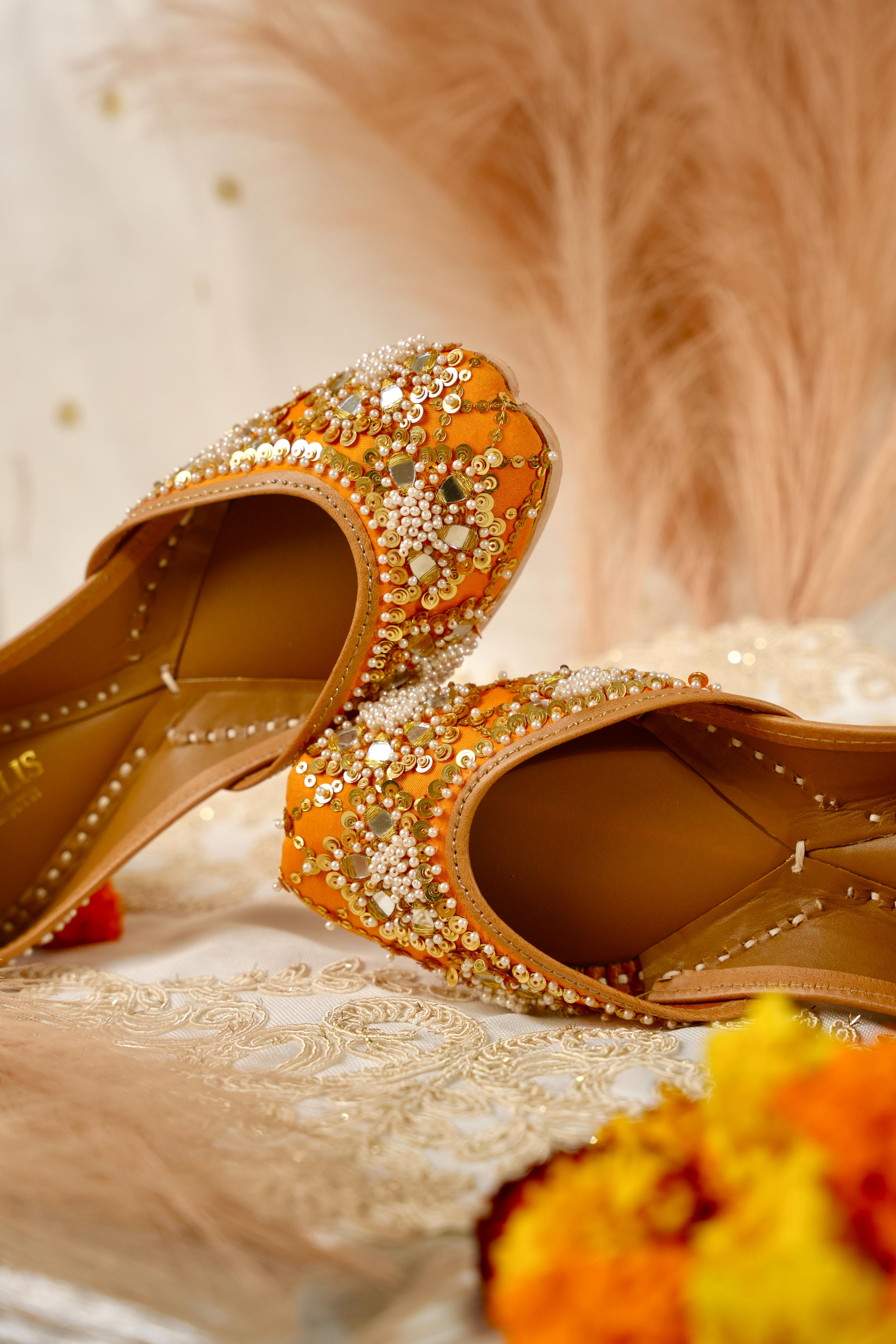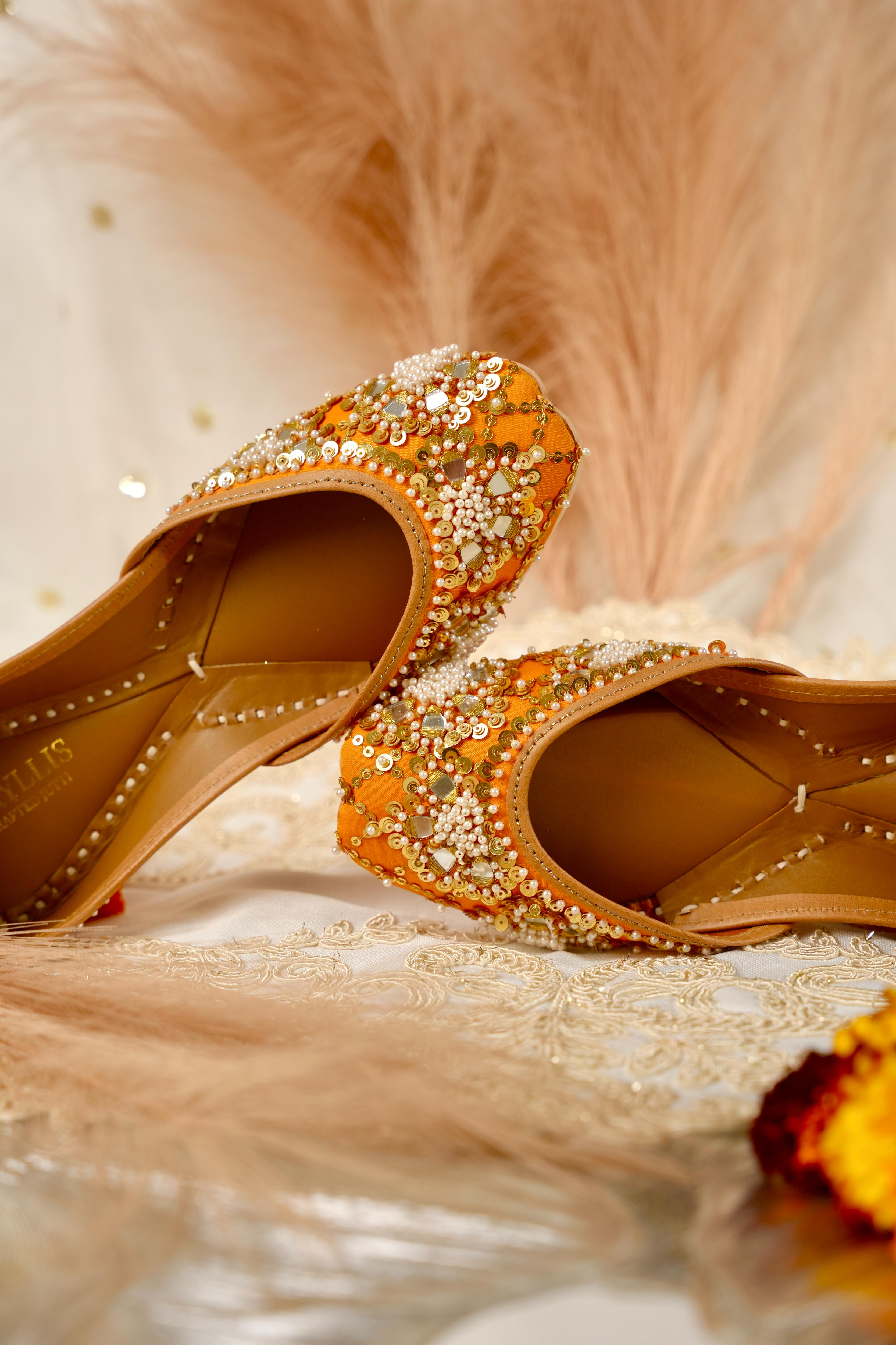 Crafted on a rich cadmium orange silk base, this jutti features intricate hand embroidery with pearls, sequins, and mirrors arranged in a delicate lattice that shimmers beautifully. Floral-inspired accents bloom at the front, while bold mirror floral motifs framed with pearls highlight the back. Graceful yet versatile, this pair complements weddings, lehengas, saris, and contemporary fusion outfits, adding effortless elegance to every occasion.