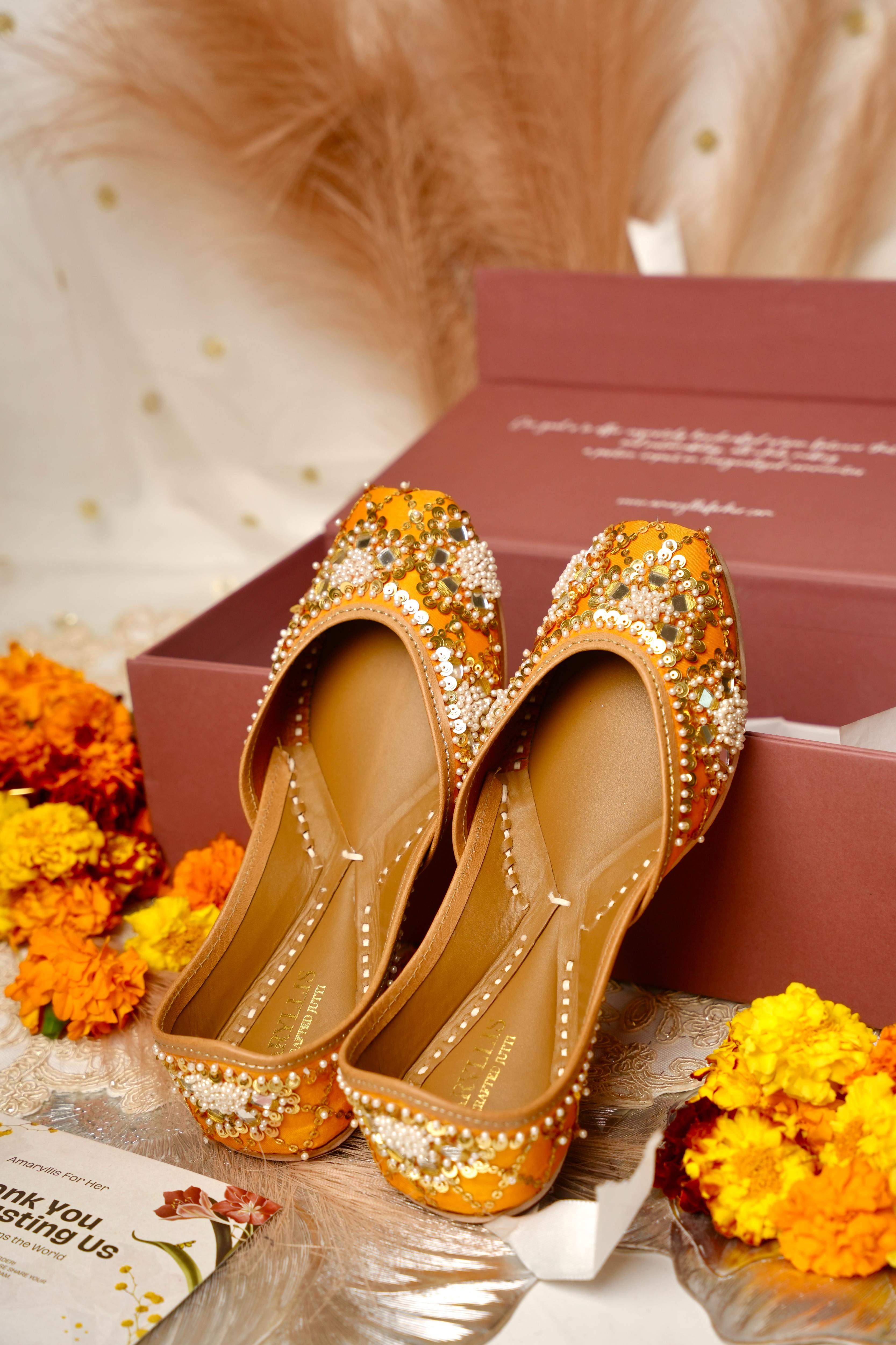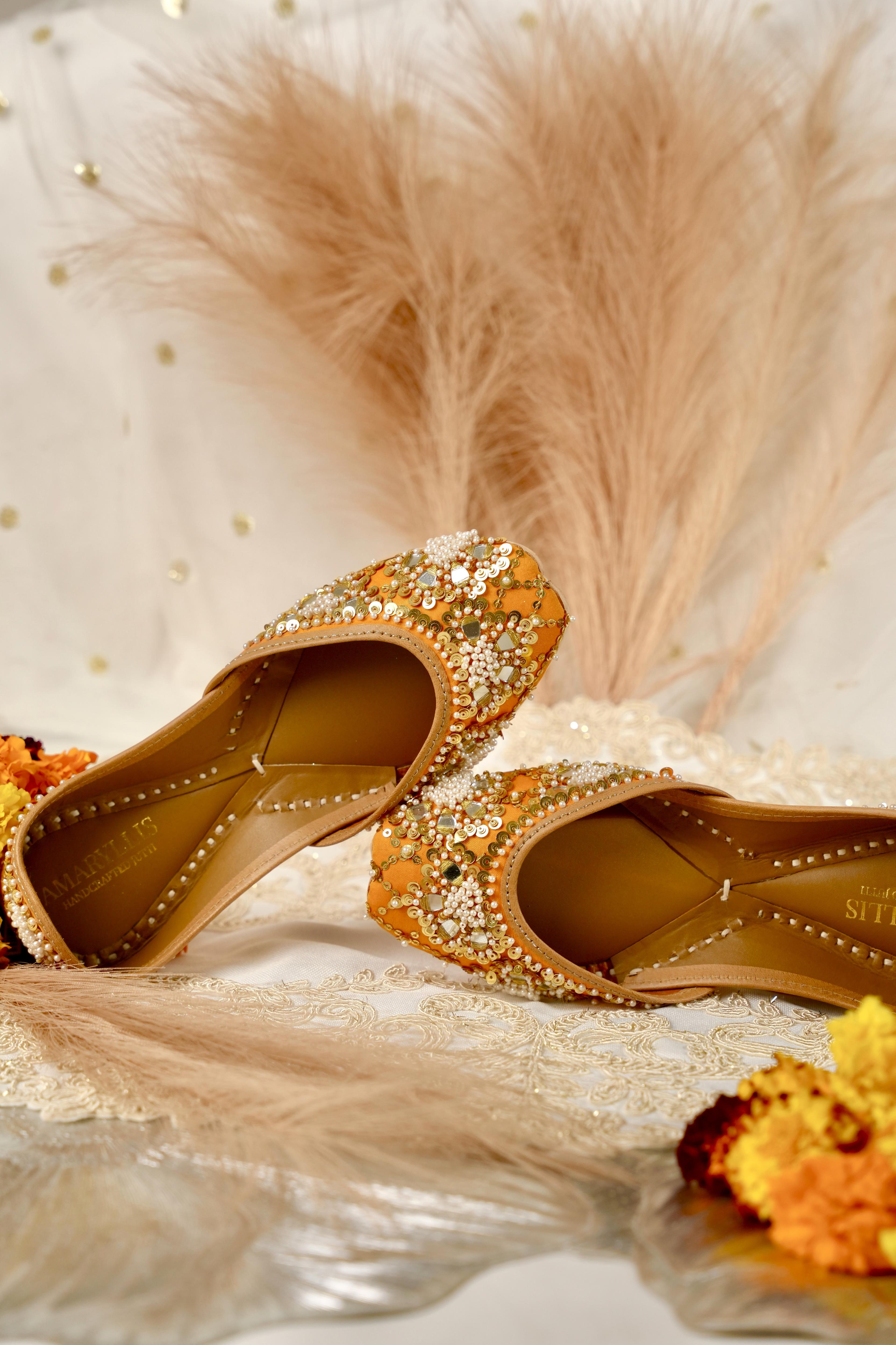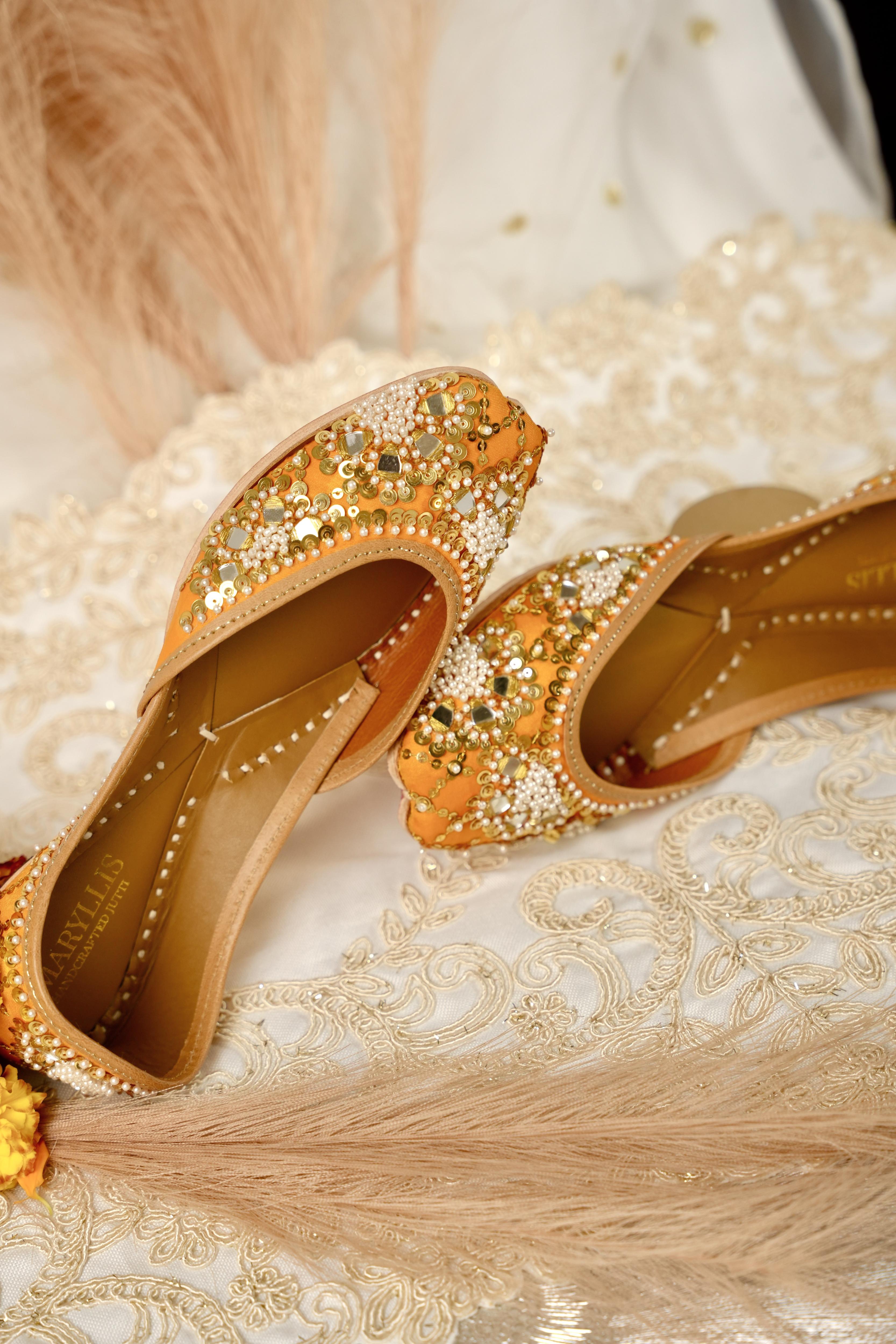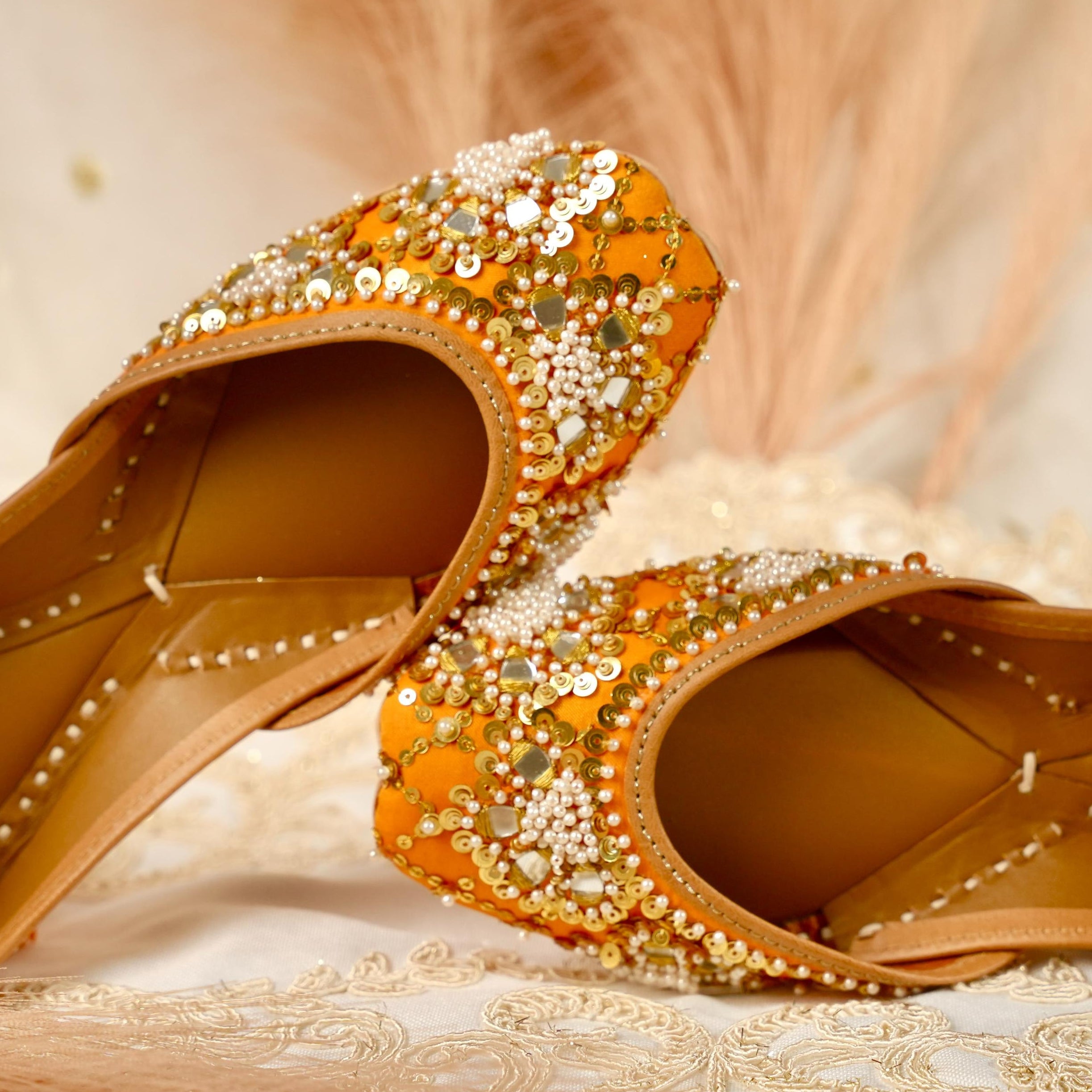 Crafted on a rich cadmium orange silk base, this jutti features intricate hand embroidery with pearls, sequins, and mirrors arranged in a delicate lattice that shimmers beautifully. Floral-inspired accents bloom at the front, while bold mirror floral motifs framed with pearls highlight the back. Graceful yet versatile, this pair complements weddings, lehengas, saris, and contemporary fusion outfits, adding effortless elegance to every occasion.